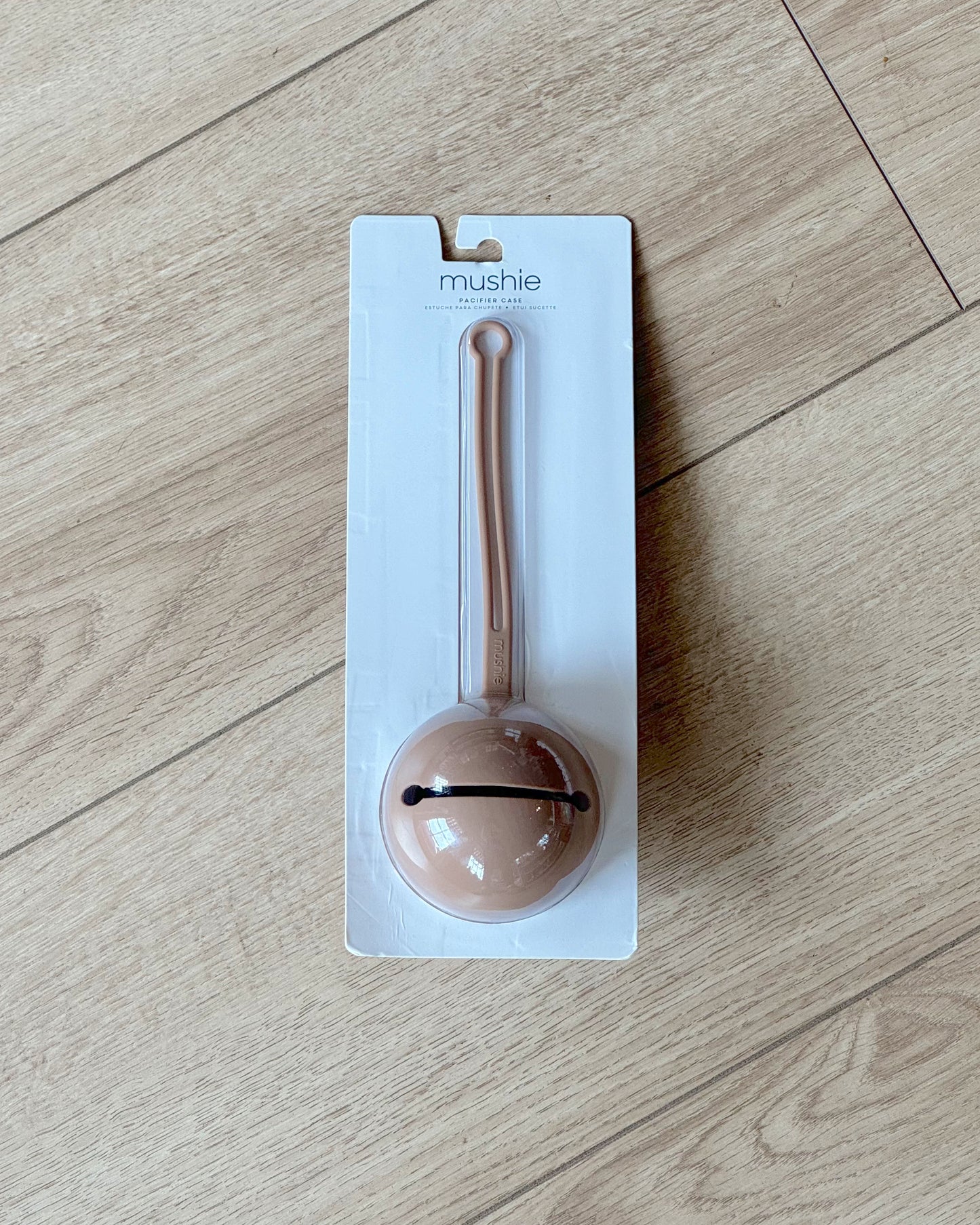 Mushie natural color pacifier holder.