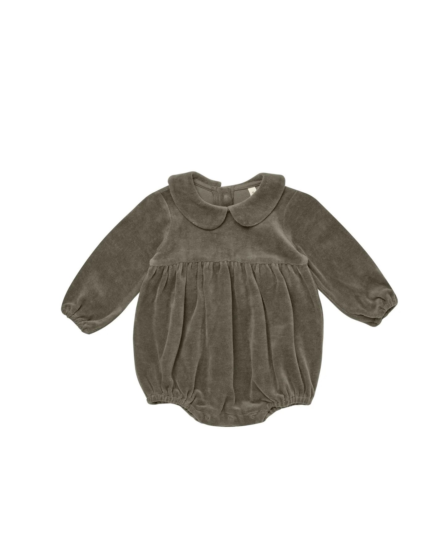 Peter Pan baby romper has long sleeves and cute peter pan collar along the neck. Also has snap buttons along the bottom for easy changing.